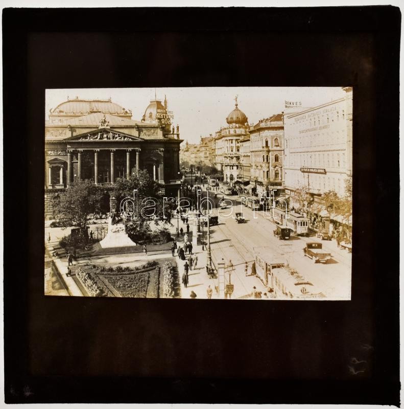Description: cca 1910 Budapest, Rákóczi út és a Nemzeti Színház, közlekedési járművekkel, 27-es villamossal, kiadva a Közgyűjtemények Terjesztő Irodája által, üvegnegatív, 8,5×8,5 cm