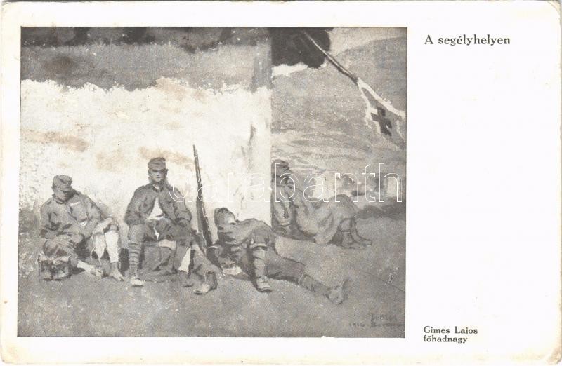 A segélyhelyen. Gimes Lajos főhadnagy alkotása. Tábori Postai Levelező...