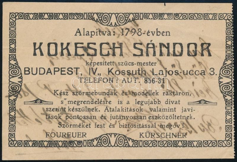 cca 1910 Kokesch Sándor szűcsmester számla Budapest