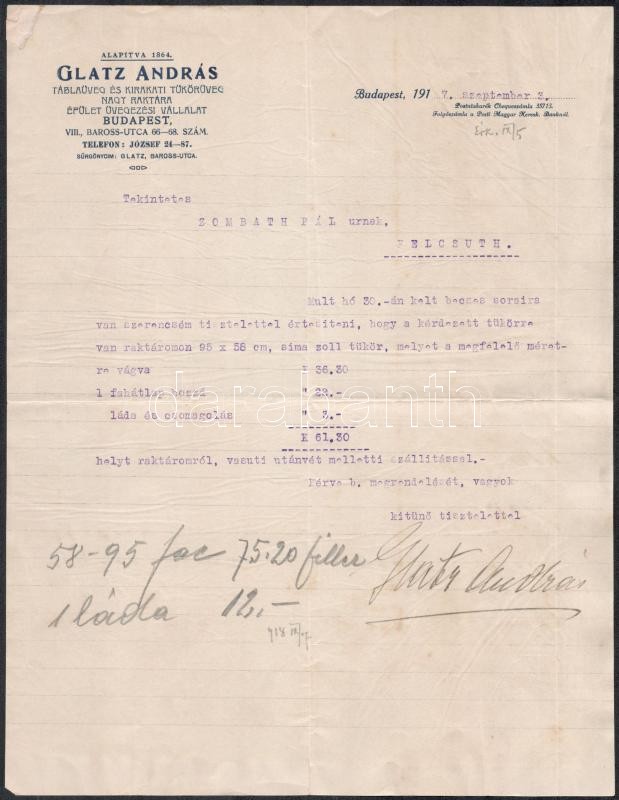 1917 Glatz András Táblaüveg és Kirakati Tükörüveg Nagy Raktára, Épület Üvegezési Vállalat fejléces számlája, Glatz András aláírásával.