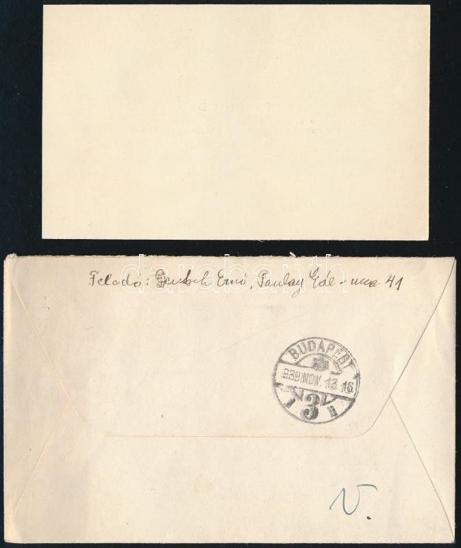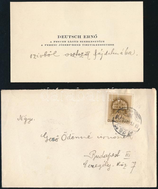 Description: 1939. novembere Deutsch Ernő, a Pester Lloyd szerkesztőjének, a Fernec József-rend tisztikeresztesének kondoleáló sorai, Gerő Ödönné, Gerő Ödön (1863-1939) műkritikus, 1919-39 között a Pester Lloyd művészeti rovat vezetője özvegyének címezve. Kézzel írt sor saját névjegykártyán, eredeti borítékban.