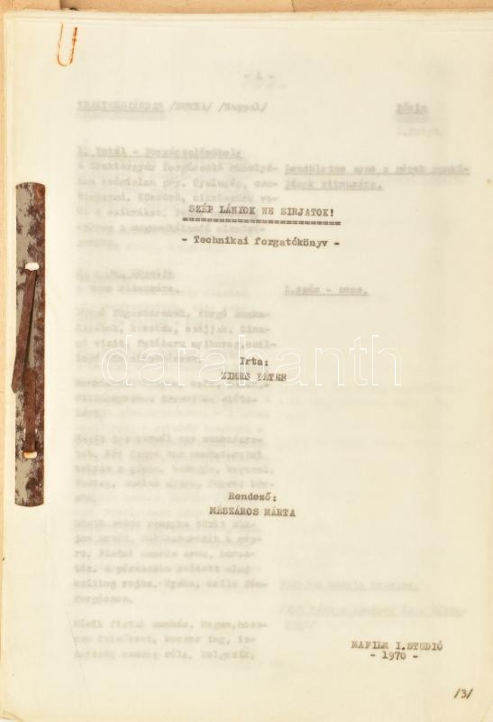 1970 "Szép leányok ne sírjatok!" technikai forgatókönyv, írta: Zimre Péter, rendező: Mészáros Márta
