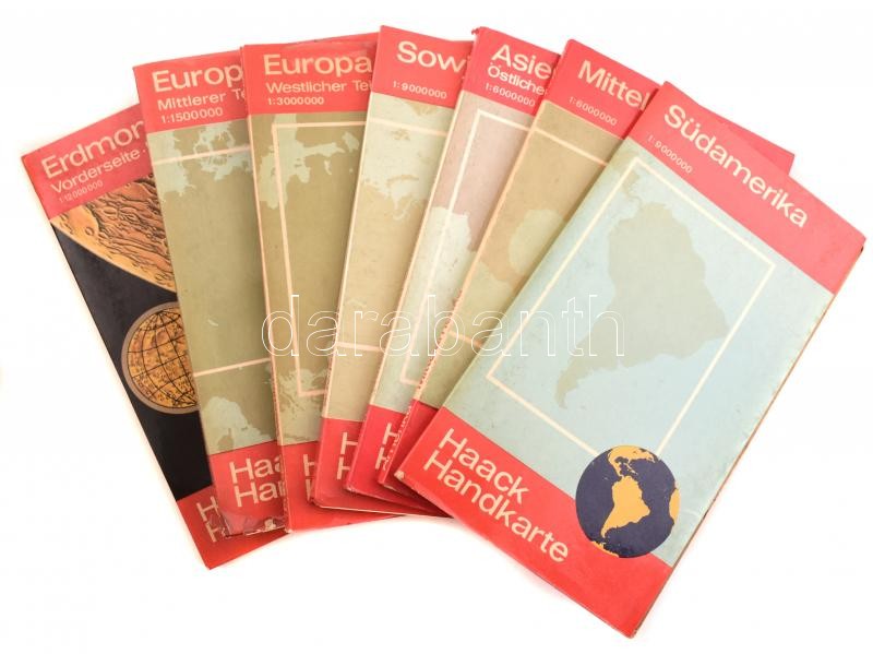 1969-1976 Haack Handkarte 7 kötete: Erdmond, Vorderseite, Rückseite, 1.12.000.000, Europa. Mittlerer Teil, 1: 1500.000, Europa, Westlicher Teil der UdSSR, 1.3.000.000, Sowjetunion, 1:9.000.000, Asien, Östlicher und sütöstlicher Teil, 1.6.000.000, Mittelamerika, 1.6.000.000, Südamerika, 1.6.000.000. Változó állapotban, különféle méretben.