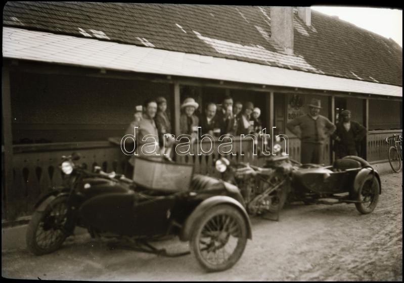 1930 Oldalkocsis motorok egy pihenőhelynél, fotónegatív tasakban, 6×9 ...