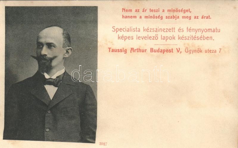 Description: Nem az ár teszi a minőséget, hanem a minőség szabja meg az árat. Specialista kézszínezett és fénynyomatú képes levelező lapok készítésében. Taussig Arthur reklámlapja a saját kiadásában 3917. Ügynök utca 7. / Hungarian postcard publisher's advertisement (r)