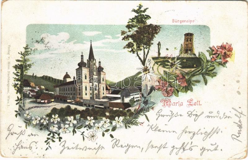 Mariazell (Steiermark), Bürgeralpe / pilgrimage church, mountain, lookout tower. Art Nouveau, floral (worn corners)