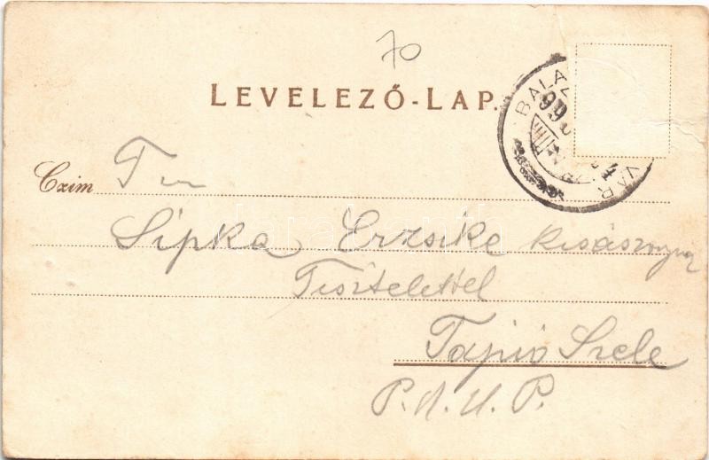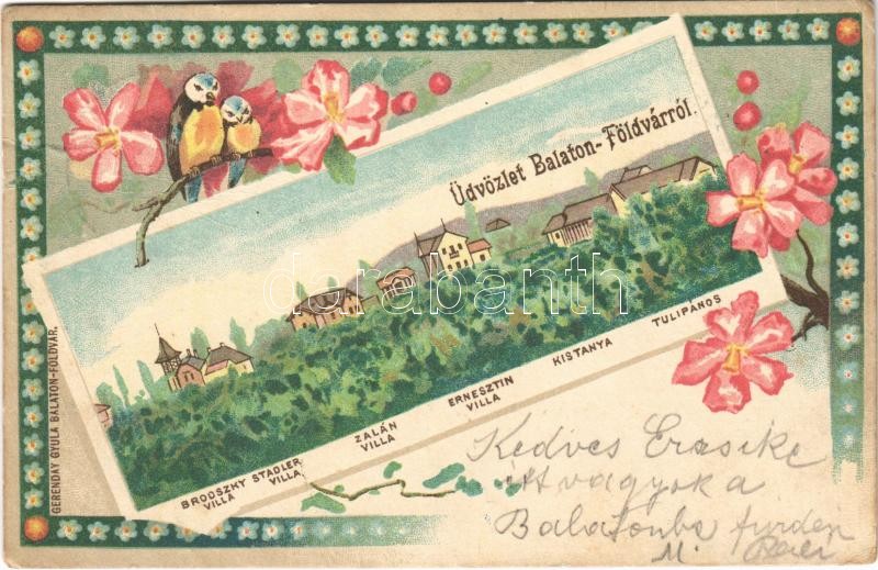 1899 Balatonföldvár, Brodszky villa, Stadler villa, Zalán villa, Ernesztin villa, Kistanya, Tulipános. Gerenday Gyula kiadása. Art Nouveau, floral, litho (Rb)