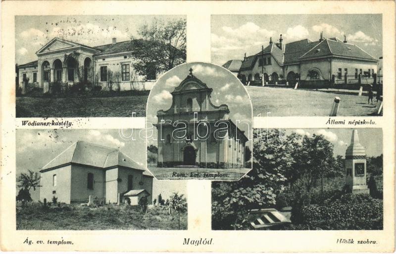 1939 Maglód, ágostai evangélikus és római katolikus templom, Hősök szobra, Állami népiskola, Wodianer kastély + "MAGLÓD P.U. SZEKRÉNYBŐL" (EK)