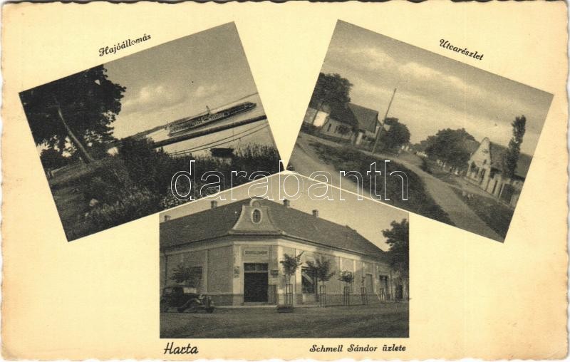 1942 Harta, Hajóállomás, utca, automobil, Schmell Sándor üzlete és saját kiadása (EK)