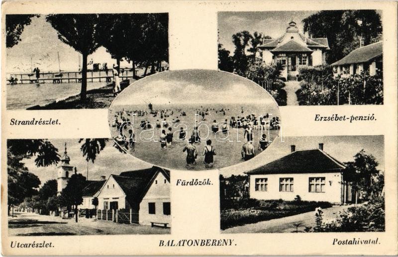 1943 Balatonberény, Strand, fürdőzők, Erzsébet penzió, utca, posta hiv...