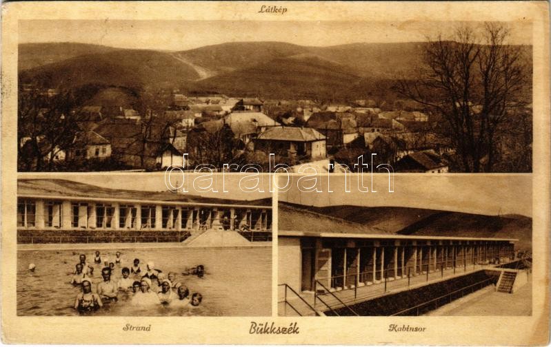 1943 Bükkszék, Strand, fürdőzők, Kabinsor, látkép. Hangya Szövetkezet kiadása (kissé ázott sarkak / slightly wet corners)