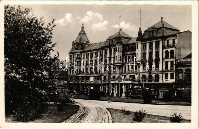 Debrecen, Arany Bika szálloda, villamos Kakas paszta reklámmal, automobil, Meteor villamossági és csillárgyár Rt., Magyar Ruhaipar, üzletek