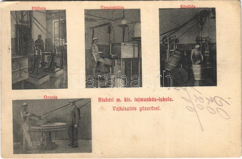 Kisbér, M. kir. tejmunkás iskola, Vajkészítés gőzerővel: fölözés, tejszínhűtés, köpülés, gyúrás. Özv. Háslinger Mórné kiadása (EK)