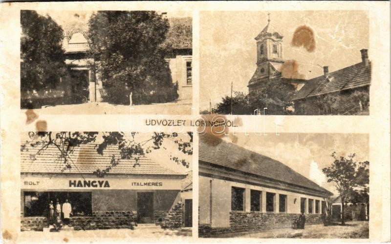 Lőrinci, Községháza, Római katolikus templom, Hangya Szövetkezet üzlete, bolt és italmérés, Iskola. Magyar Mihály felvétele és kiadása (Rb)