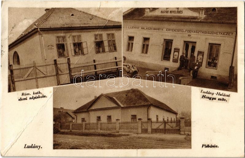 Ludány (Ludányhalászi), Római katolikus elemi népiskola, Plébánia, automobil, Ludány-Halászi Hangya Szövetkezet üzlete és saját kiadása (fa)
