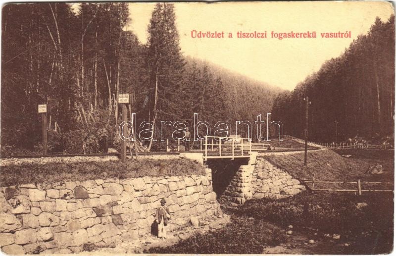 Tiszolc, Tisovec; Fogaskerekű vasúti híd, "Fogasrúd kezdet" tábla. Kreisler József kiadása / cogwheel railway bridge (fa)
