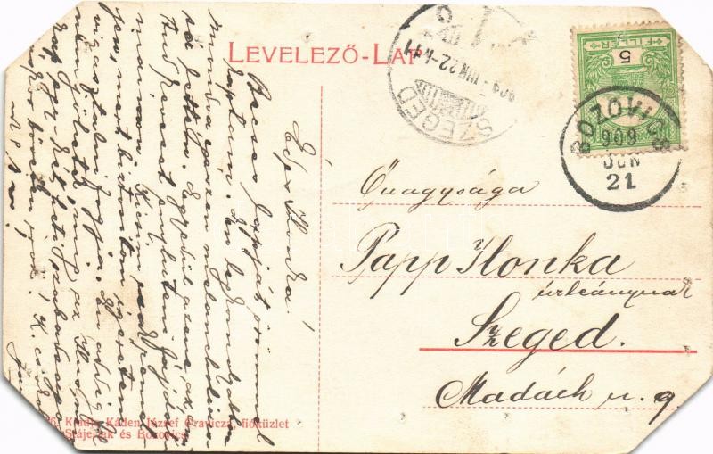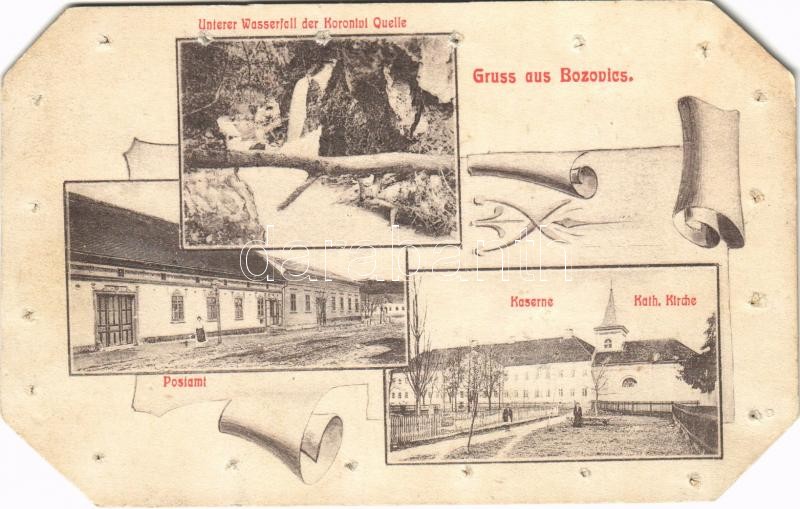 Description: 1909 Bozovics, Bozovici; laktanya, katolikus templom, posta, alsó vízesés a Koronivi forrással. Káden József kiadása / military barracks, church, post office, waterfall. Art Nouveau (lyukak / pinholes)