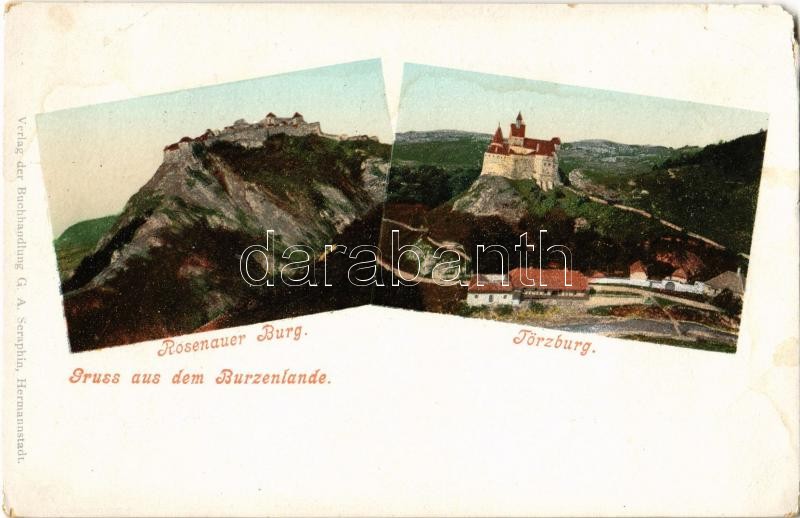 Barcaság, Burzenland, Tara Barsei; Rosenauer Burg, Törzburg / Barcarozsnyó vára, Törcsvár. Kiadja G. A. Seraphin / Cetatea Rasnov, Castelul Bran (Bran-Poarta) / castles of Burzenland (Rb)