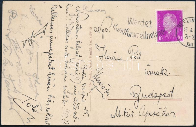 1933 Minerva Berlin - FTC (1-5, 1933. ápr. 16.) húsvéti torna játékosainak aláírásai, Lázár, Székely, Toldi, Táncos, Takács, Korányi, Lyka Antal (Toto), Turay, Háda, Kovács, és mások