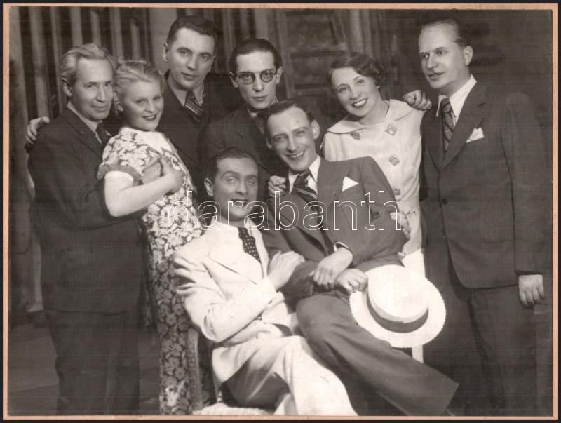 Description: 1935 Áldor Dezső csoportképe, színészekkel. Nagy méretű csoportkép aláírásokkal: Dajka Margit, Latabár Kálmán, Fejes Teri, stb. Szignált. ROssz állapotban, hiányos karton. 39x30 cm