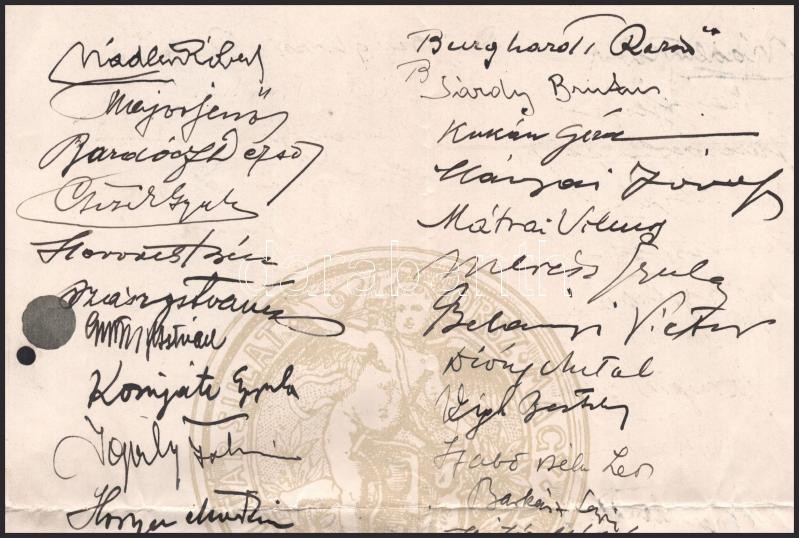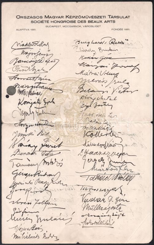 cca 1920-30 A kor híres, neves festőművészei, grafikusai autográf aláírásai: Nádler Róbert, Major Jenő, Bardócz Dezső, Csizik Gyula, Komjáti-Wanyerka Gyula, Juszkó Béla, Geiger Richárd, Veress Zoltán, Wágner Géza, Mihálovits Mikjlós, Burghardt Rezső, Sárdy Brutus, Kukán Géza, Mányai József, Mátrai Vilmos, Merész Gyula, Belányi Viktor, Diósy Antal, Vígh Bertalan, Szabó Béla Leo, Barkász Lajos, Vitéz Mátyás, Gergely Imre, Lühnsdorf Károly, Márton Ferenc, Turmayer Sándor, Neogrády László stb, össz. 45, részben beazonosításra váró aláírás, Országos Magyar Képzőművészeti Társulat fejléces papírján, hajtásnyommal, apró szakadásokkal