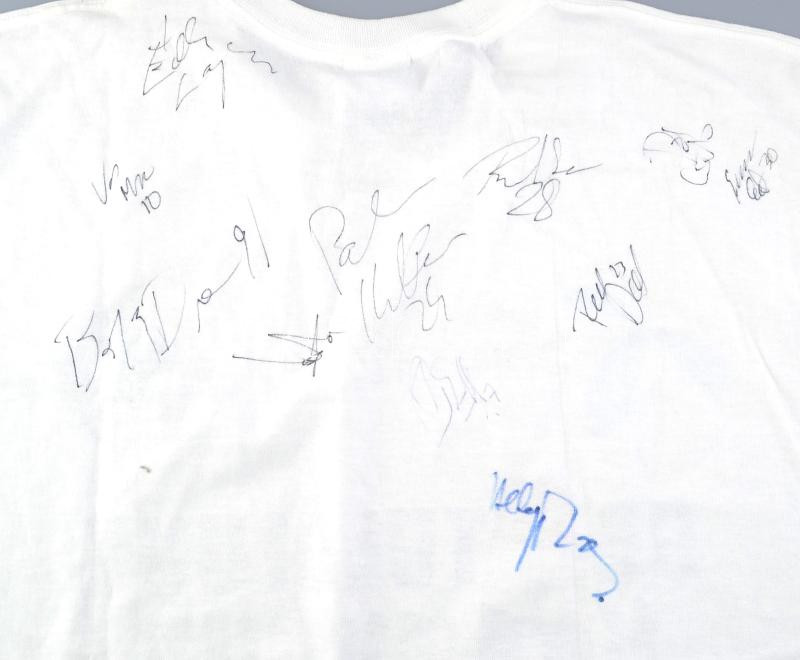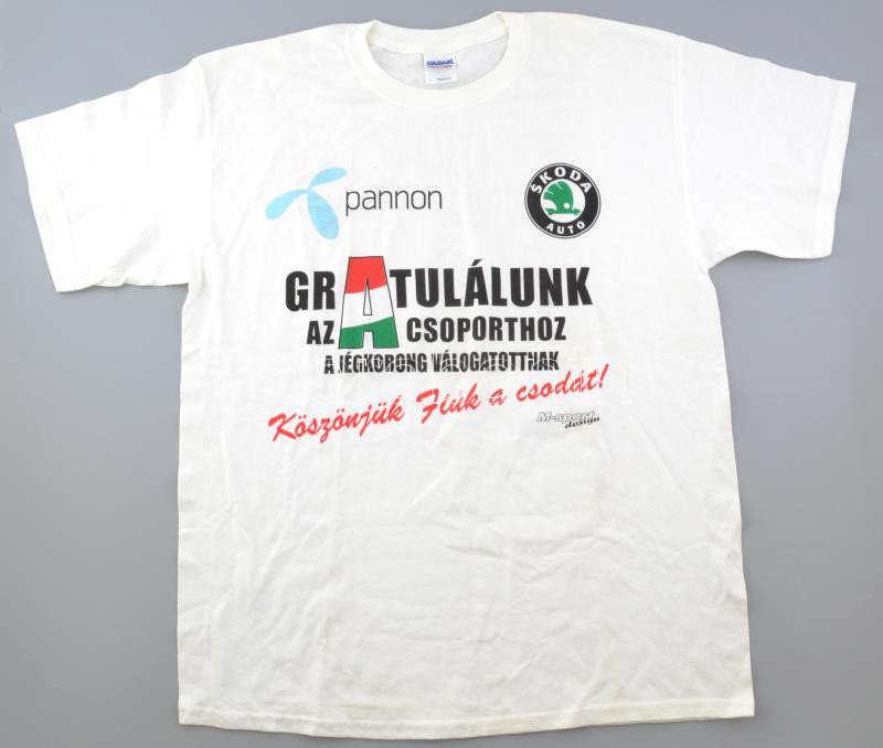 Description: cca 2008 "Gratulálunk az A csoporthoz a jégkorong válogatottnak. Köszönjük fiúk a csodát!" feliratú póló, a hátoldalon a Jégkorong válogatott tagjainak aláírásaival.