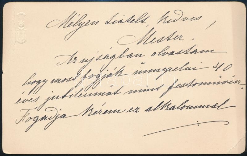 1930. II. 7. Sikorska Zsolnay Júlia (1856-1950) autográf gratuláló sorai Kézdi-Kovács László (1864-1942) festőművészhez, festőművészi pályája 40 éves jubileuma alkalmából. Két kézzel írt oldal, dombornyomott címeres kártyán, Sikorska Zsolnay Júlia autográf aláírásával, kártya széle kissé sérült.