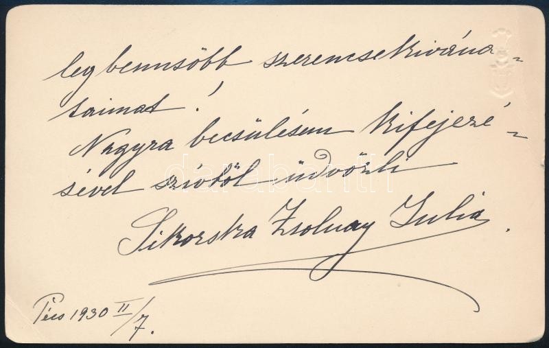 1930. II. 7. Sikorska Zsolnay Júlia (1856-1950) autográf gratuláló sor...