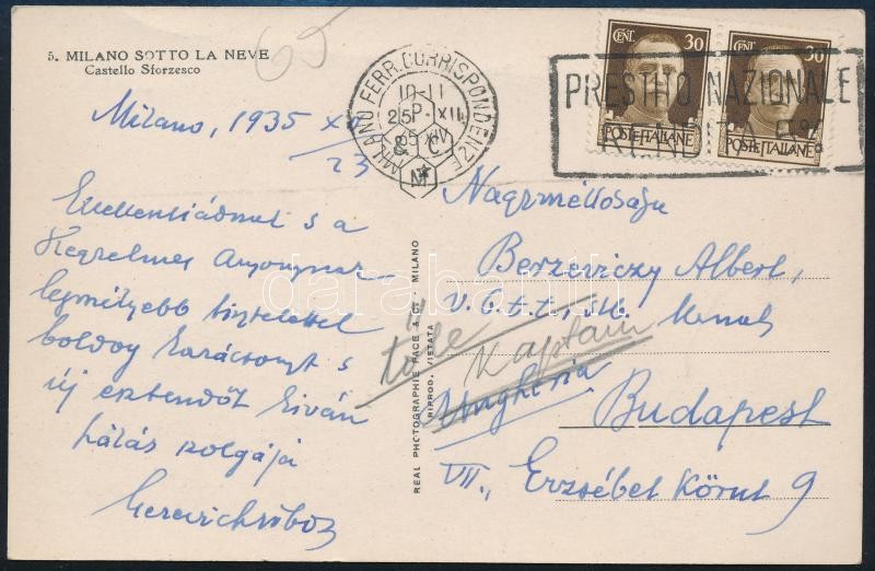 Description: 1935 Milánó, Gerevich Tibor (1882-1954) művészettörténész, művelődéspolitikus, a Római Magyar Akadémia igazgatójának (1925-1944), és a Műemlékek Országos Bizottságának (MOB) elnökének (1932- 1948) saját kézzel írt üdvözlő képeslapja Berzeviczy Albert (1853-1936) politikus, történetíró, egykori miniszter, a Magyar Tudományos Akadémia elnöke (1905-1936) és a Kisfaludy Társaság elnöke (1923-1936) részére.