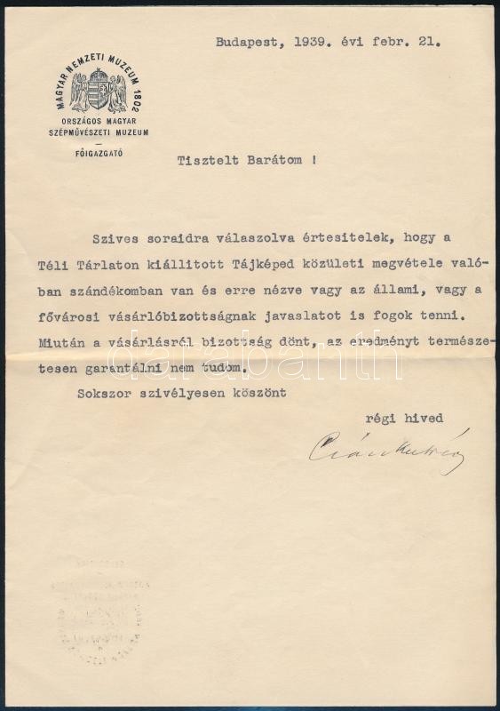 Description: 1939 Csánky Dénes (1885-1972) festőművész, a Szépművészeti Múzeum igazgatója autográf aláírással ellátott levele Eölvedi Gachal József (1889-1972) festőművésznek, melyben jelzi, hogy a Téli Tárlaton szerepelt tájképét meg kívánja vásárolni