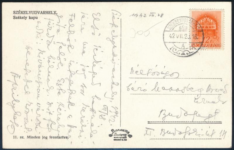 Description: 1942 Székelyudvarhely, Áprily Lajos (1887-1967) költő,műfordító saját kézzel írt képeslapja báró Mannsberg Arvéd (1890-1970) a Ganz-Danubius közgazdásza, Reményik Sándor egyetemi évfolyamtársa, Fejér vármegyei földbirtokos részére.