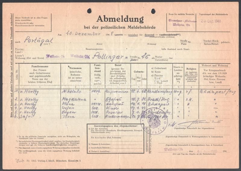 1948 december 20. Horthy Miklós és családjának kijelentkező lapja a németországi Weilheimből Portugáliába. A Pollinger strassei címen 1945 júniusától kezdve éltek. Előtte a Weilheim melletti Hirschberg kastélyban őrizte őket először a Gestapo, majd az amerikai katonai őrség. Tintaceruza, papír. / Document of Miklós Horthy, Hungarian statesman, regent of Hungary (1920-1944) and his family signing out from the address in Weilheim (Bavaria, Germany), where they were kept first by the Gestapo, then by the U.S. military police at the end of WWII