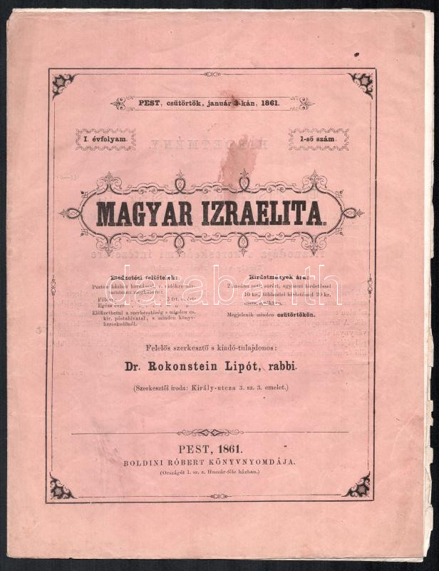 1861 Magyar Izraelita, Pest, 1861. jan. 3., I. évf. 1. sz. Szerk.: Rokonstein Lipót rabbi. Pest, 1861, Boldini Róbert, kissé foltos borítóval és lapokkal, egy lapon egészen apró lapszéli szakadásokkal, 8 p. Az első lapon adóbélyegzéssel. Első magyar nyelvű zsidó hetilap I. évf. 1. száma.