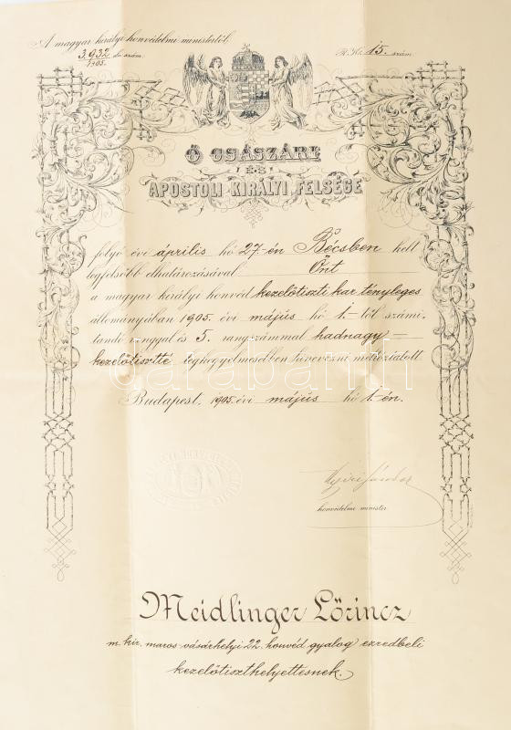Nyíri Sándor (1854-1911.) honvéd altábornagy, honvédelmi miniszter autográf aláírása hadnagy kezelőtiszt kinevezési okmányán. Dombornyomott angyalos címerrel.