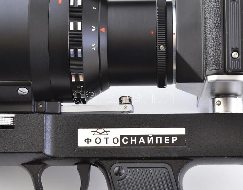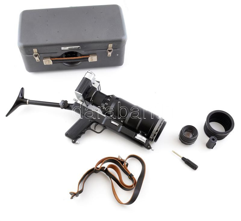 Description: Zenit EC fotópuska Tair Z FC 4,5/300 és Helios 44-2 2/58 objektívekkel. Teljes szett, jó állapotú fém dobozban. A Nagy kémkönyvben reprodukálva. / Photo camera gun used by spies as well. Complete set in metal box