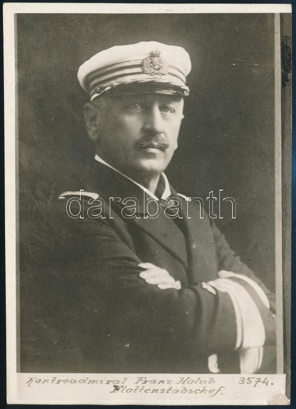 cca 1914-1918 Franz von Holub (1865-1924) ellentengernagy, az Osztrák-Magyar Cs. és Kir. Haditengerészet (K.u.K. Kriegsmarine) vezérkari tisztje, feliratozott fotó, egyik sarkán kis sérüléssel, 18x13 cm / cca 1914-1918 Franz von Holub rear admiral, chief officer of the Austro-Hungarian Navy (K.u.K. Kriegsmarine), photo with description on the bottom, with minor damage on one corner, 18x13 cm