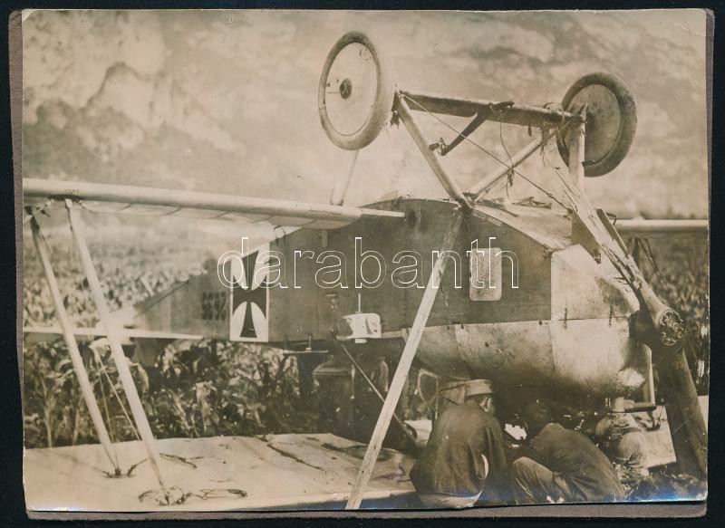 Description: cca 1915 Légi csatában kilőtt (a légcsavaron gépfegyvertalálatot kapott) német Hansa-Brandenburg repülőgép az olasz fronton, I. világháborús fotó, kartonra ragasztva, hátoldalán feliratozva, 10,5x8 cm