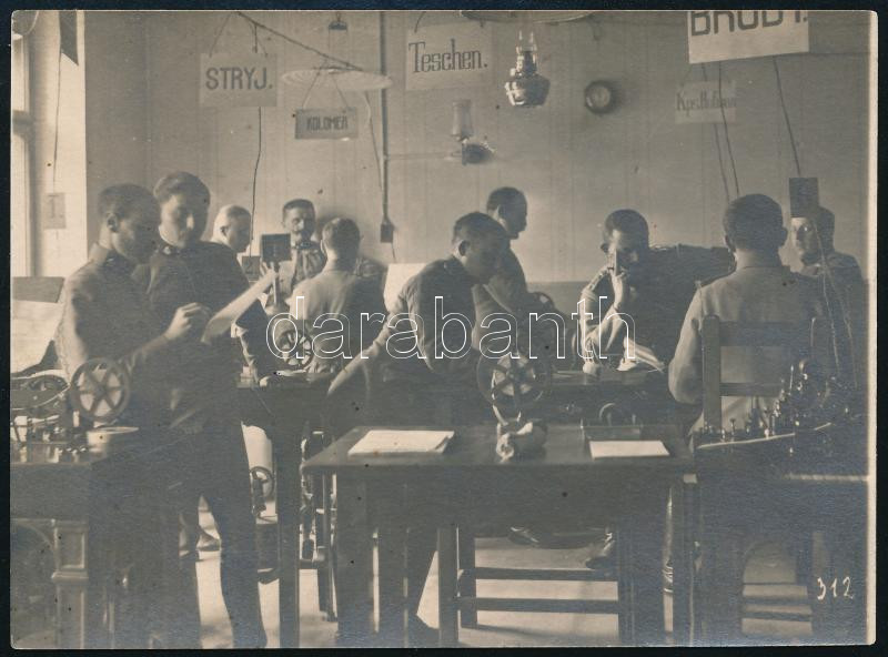cca 1915 Távírószoba Brzezany-ban, Kelet-Galíciában (Ukrajna), fotó hátoldalon feliratozva, 8×11 cm