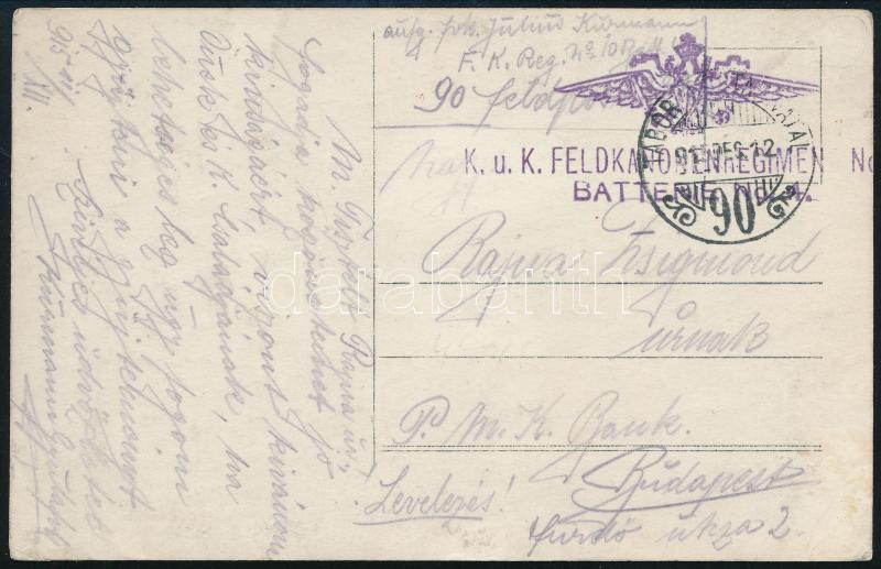 1915 Fogoly orosz tisztek egy tábori ágyús osztagnál, hátoldalon pecséttel ellátott fotó, lapként elküldve, szép állapotban, 9×13,5 cm / POW Russian officers, photo