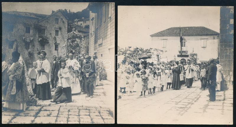 1916 Körmenet Perastóban (Perast) Montenegróban, hátoldalt magyar felirattal, 2 db fotó, 8,5×7,5 cm / procession in Perast, Montenegro, 2 photos