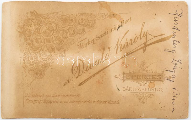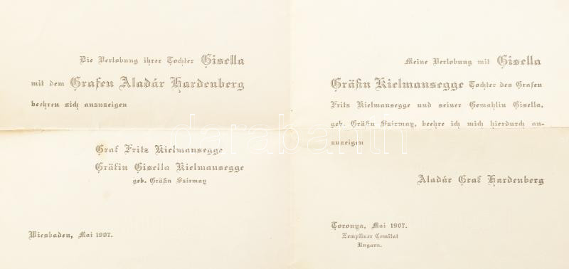 cca 1870-1890 Aladár von Hardenberg (1861-1934) gyerekkori portréfotója (Drezda, Hugo Thiele műterméből) és első felesége gróf Hardenberg Aladárné Lónyay Vilma (1869-1897) portréfotója (Eperjes-Bártfa, Divald Károly műterméből, az egyik széle vágott), és a Hardenberg kastély (Nörten-Hardenberg) fotója, valamint 17x10 és 16x10 cm közötti méretben + 1907 gróf Gizella Kielmansegg (1880-1953) és gróf Aladár Hardenberg esküvői meghívója