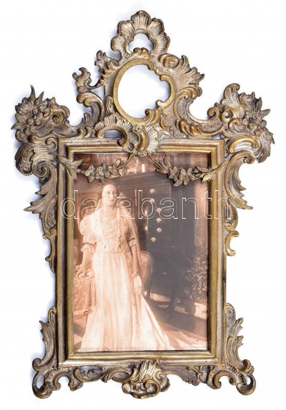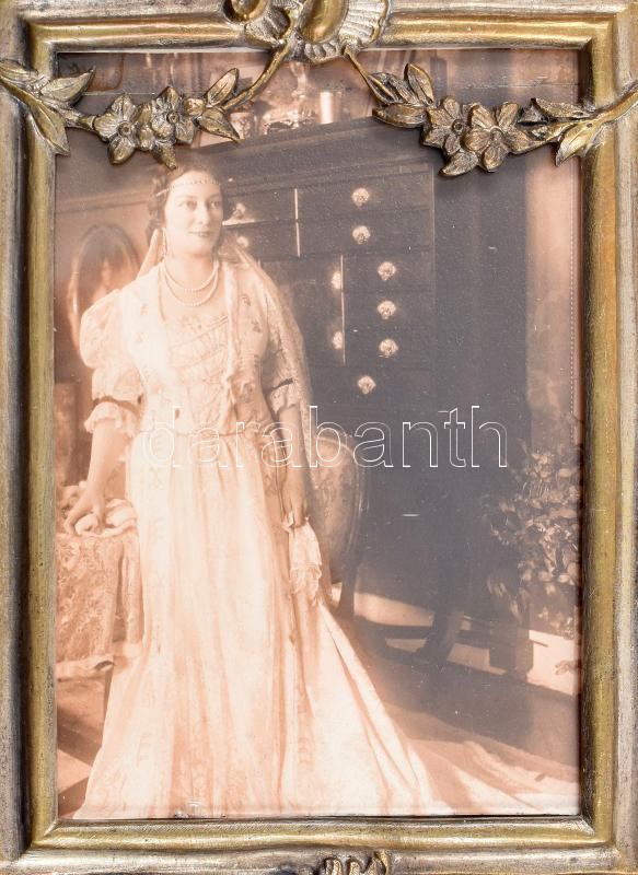 cca 1910-1920 Üchtritz-Amade grófné báró Bánhidy Stefánia esküvői fotója, rendkívül dekoratív, üvegezett, öntött réz képkeretben, 11x8 cm (keret mérete: 21x14 cm)