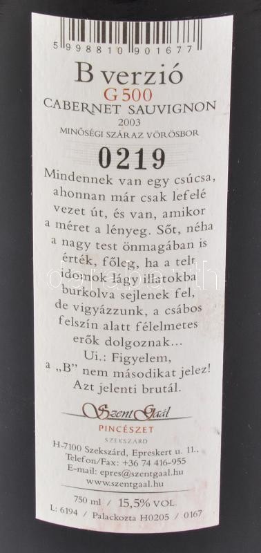 2003 Szent Gaál Szekszárdi "B Verzió G500" Cabernet Sauvignon, bontatlan palack száraz vörösbor, pincében szakszerűen tárolt, 15,5%, 0,75l. 1200 palackkal került lepalackozásra, amelyből 1000 került kereskedelmi forgalomba. 0219. számú palack. Ritka! "Ui.: Figyelem, a "B" nem másodikat jelez! Azt jelenti brutál." A G500 a durva hozamkorlátozásra utal, a mindössze 500 gramm/ tőkére. A 2006-os piacra kerülésekor a legdrágább hazai vörösbor volt.