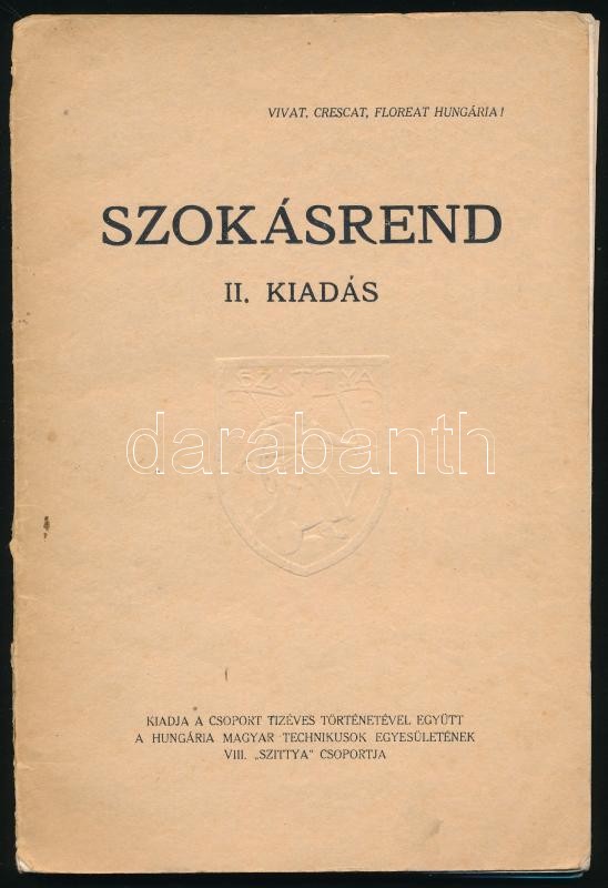 Description: Szokásrend. II. kiadás. A csoport "dominus praesens maiorja", Koiss Géza által DEDIKÁLT példány." Bp., 1930., Hungária M(agyar) T(echnikusok) E(gyesületének) VIII. "Szittya" Csoportja, 87 p.+ 4 t. Kiadói papírkötés., a borítón szakadással, benne gépelt levéllel, kártyával.