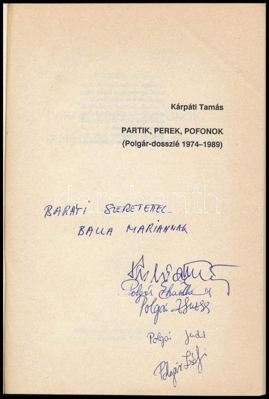 Kárpáti Tamás: Partik, perek, pofonok. (Polgár-dosszié 1974-1989). Bp., 1989, Magyar Eszperantó Szövetség, 152 p. Kiadói papírkötés. A Polgár-család tagjai, Polgár László (1946- ) eszperantista, pedagógus, sakkedző, Polgár Zsuzsa (1969- ), Polgár Zsófia (1974- ) és Polgár Judit (1976- ) sakkozók (Polgár lányok) által DEDIKÁLT példány (+1 további aláírás, feltehetőleg Polgár Lászlóné Altberger Klára). + A Polgár-családot ábrázoló fotó, 17,5x12,5 cm