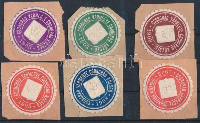 1903 6 db klf színű címeres Csongrád Vármegye Csongrád község levélzár...
