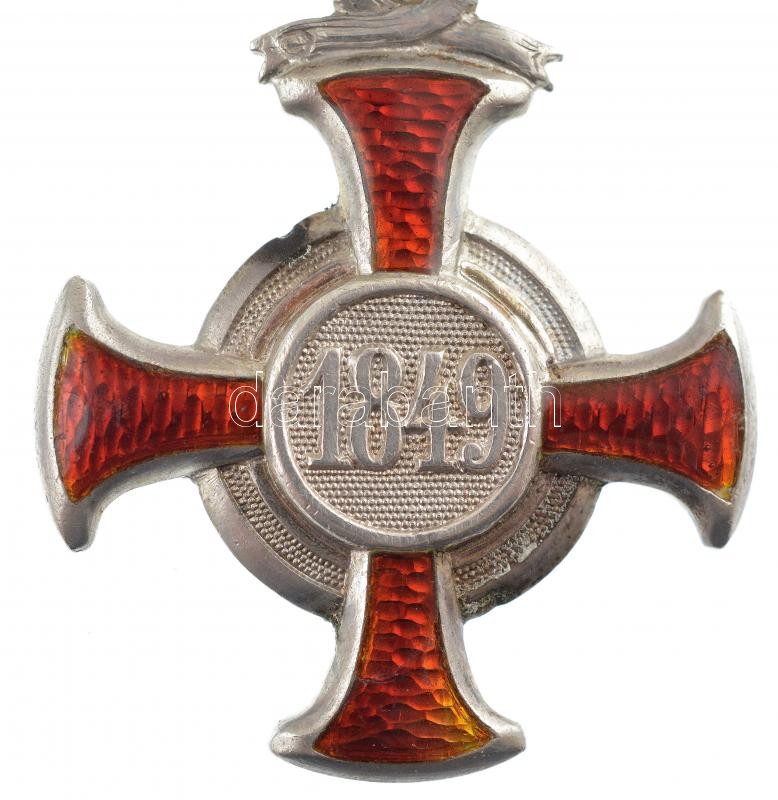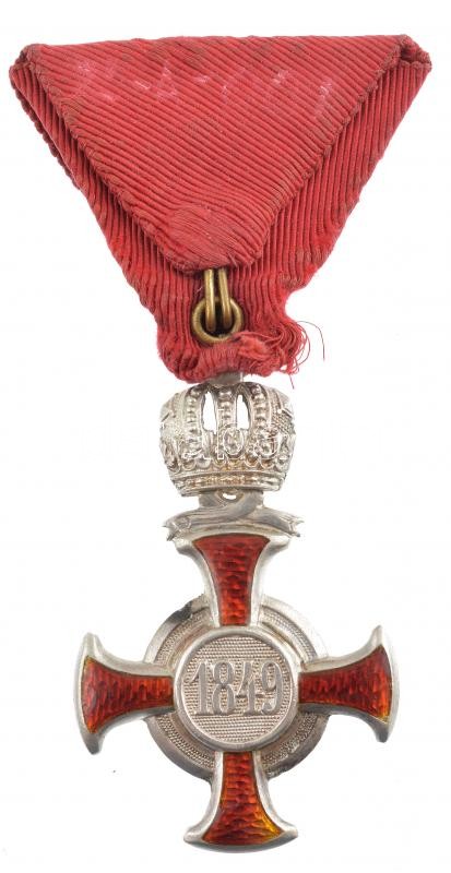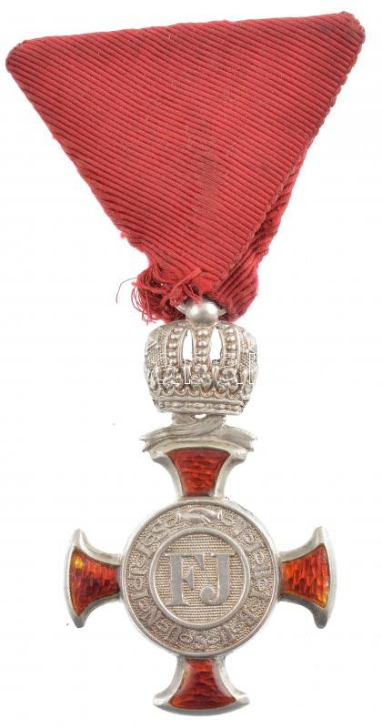 Hungary 1869-1916. "Silver Merit Cross with the Crown on red ribbon" hallmarked Ag decoration on ribbon, with "ROZET & FISCHMEISTER WIEN" maker's mark on the suspension ring C:XF the medallion is damaged on a few small places, enamel error, worn ribbon