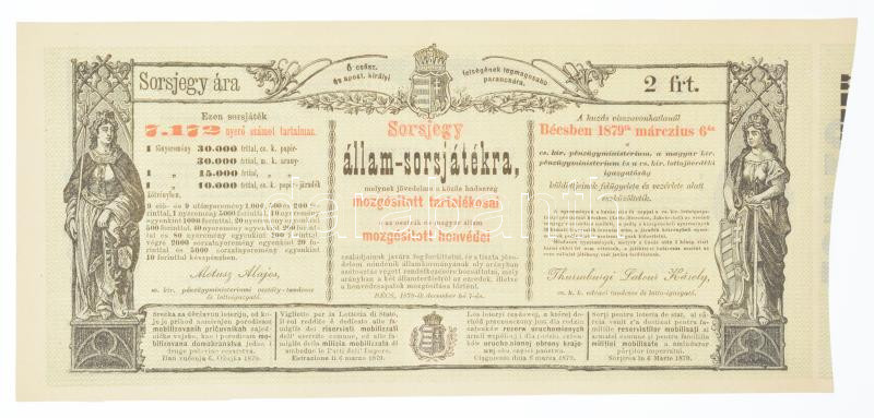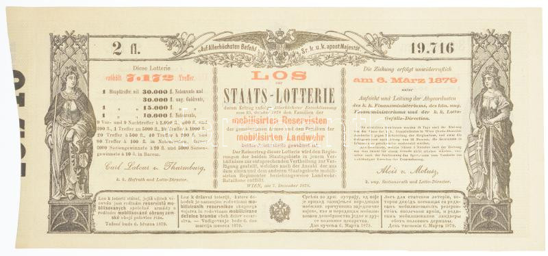 Ausztria / Bécs 1878. "Sorsjegy állam-sorsjátékra a közös hadsereg mozgósított tartalékosai s az osztrák és magyar állam mozgósított honvédei családjai javára" T:II / Austria / Vienna 1878. "State Lottery Ticket for the Reservist of the Joint Army and the Families of the mobilized Honved's" C:XF