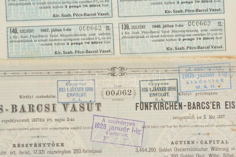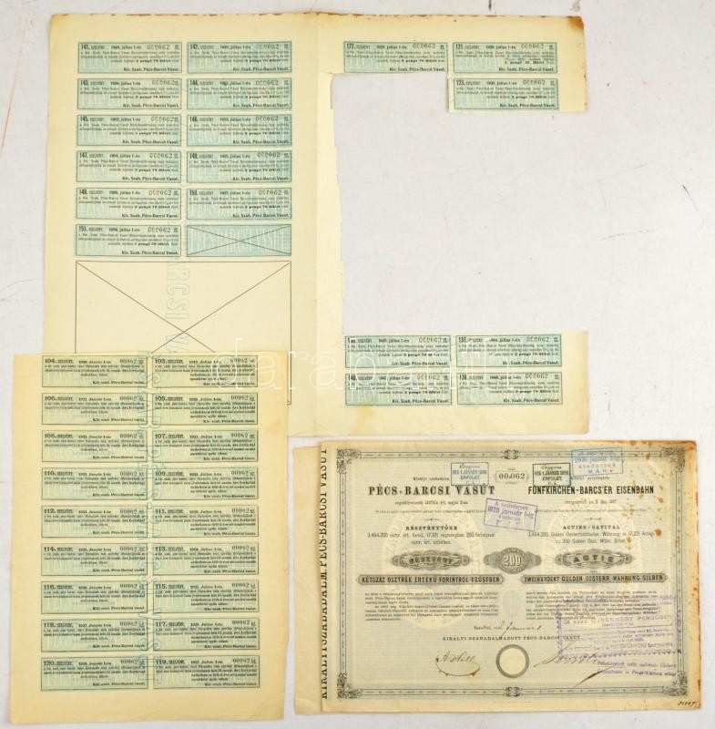 Buda-Pest 1868. "Pécs-Barcsi vasút" részvénye 200Ft értékben szárazpecséttel, szelvényekkel, bélyegzésekkel T:III fo., szakadások, ragasztás / Hungary / Buda-Pest "Pécs-Barcs Railway" share about 200 Forints with embossed stamp, coupons amd overprints C:F spotted, tears, sticked