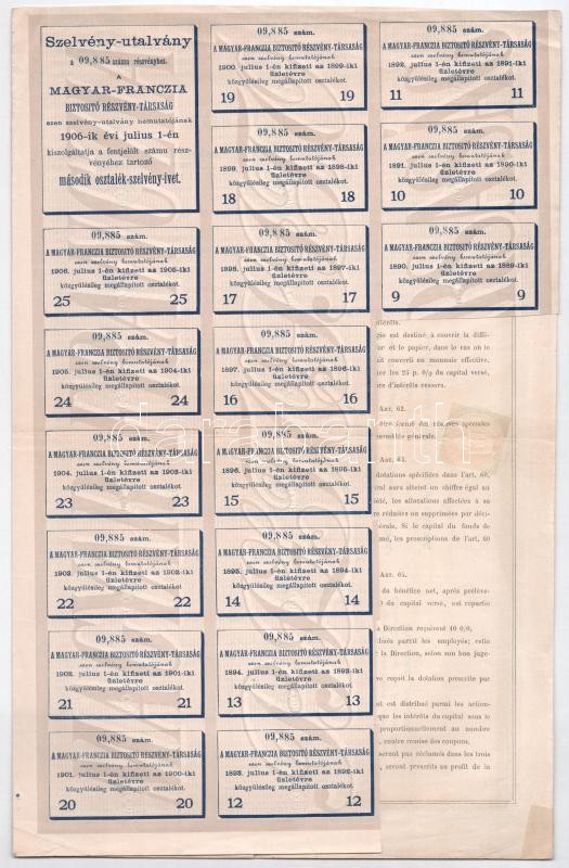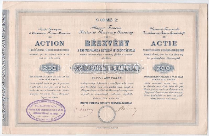 Budapest 1884. "Magyar-Franczia Biztosító Részvény-Társaság" részvénye 200Ft-ról szárazpecséttel, bélyegzéssel, szelvényekkel T:III tűlyukak, kis szakadás / Hungary / Budapest 1884. "Hungarian-French Insurance Company" share about 200 Forint with embossed stamp, overprint and coupons C:F needle holes, small tears